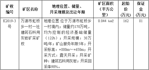 根據(jù)《中華人民共和國礦產(chǎn)資源法》、國土資源部《礦業(yè)權(quán)出讓轉(zhuǎn)讓管理暫行規(guī)定》、《探礦權(quán)采礦權(quán)招標(biāo)拍賣掛牌管理辦法(試行)》等規(guī)定,經(jīng)萬源市人民政府批準(zhǔn),萬源市自然資源局決定以拍賣方式出讓K2019-3號(hào)(萬源市虹橋鄉(xiāng)一村一社建筑石料用灰?guī)r礦采礦權(quán))采礦權(quán),我中心受萬源市自然資源局委托對(duì)以上采礦權(quán)組織拍賣,現(xiàn)將有關(guān)事項(xiàng)公告如下:
