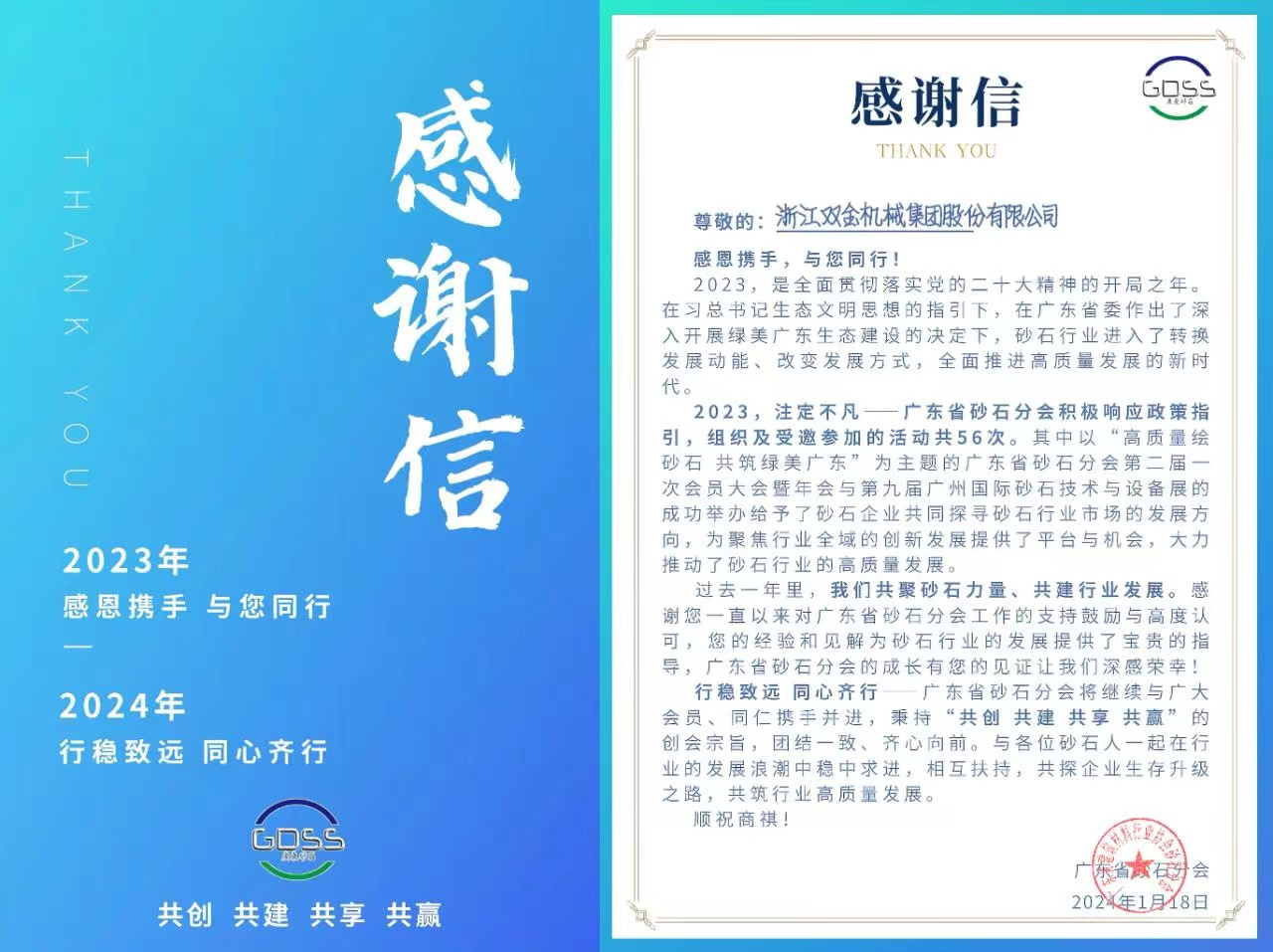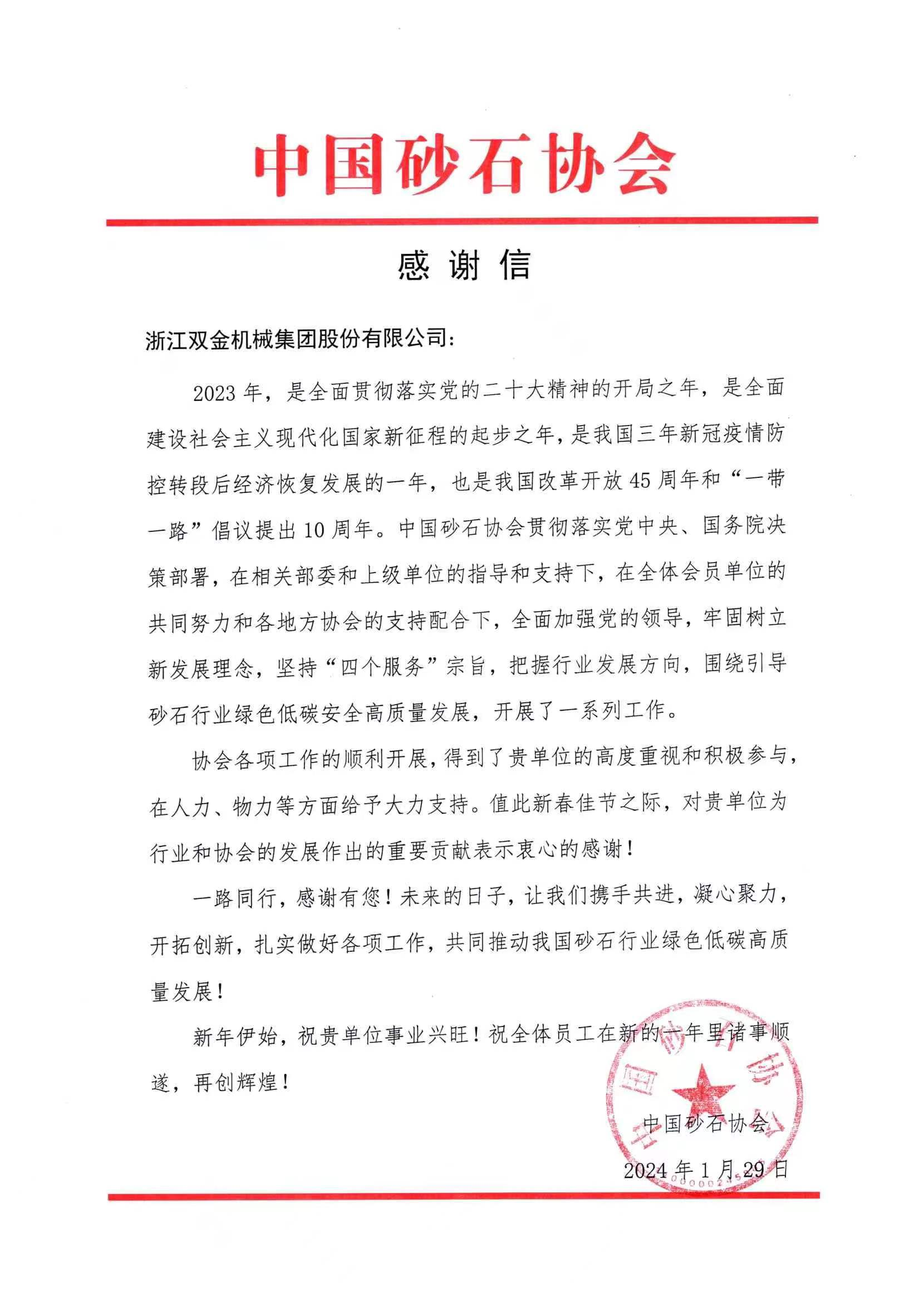 在這2024喜慶祥和的龍年到來之際,浙江雙金機械集團股份有限公司收到來自中國砂石協(xié)會、廣東省砂石協(xié)會送來的感謝信。砂石協(xié)會對雙金集團過去一年對砂石行業(yè)和協(xié)會發(fā)展作出的貢獻給予肯定,這是我們的一份榮譽,更是一份至高無上的社會責任與擔當。