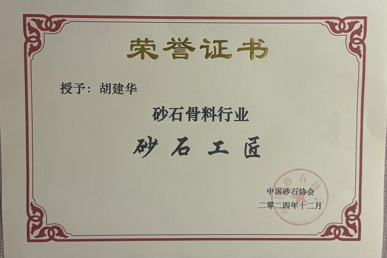 公司總經(jīng)理胡建華被評為“砂石骨料行業(yè)砂石工匠”