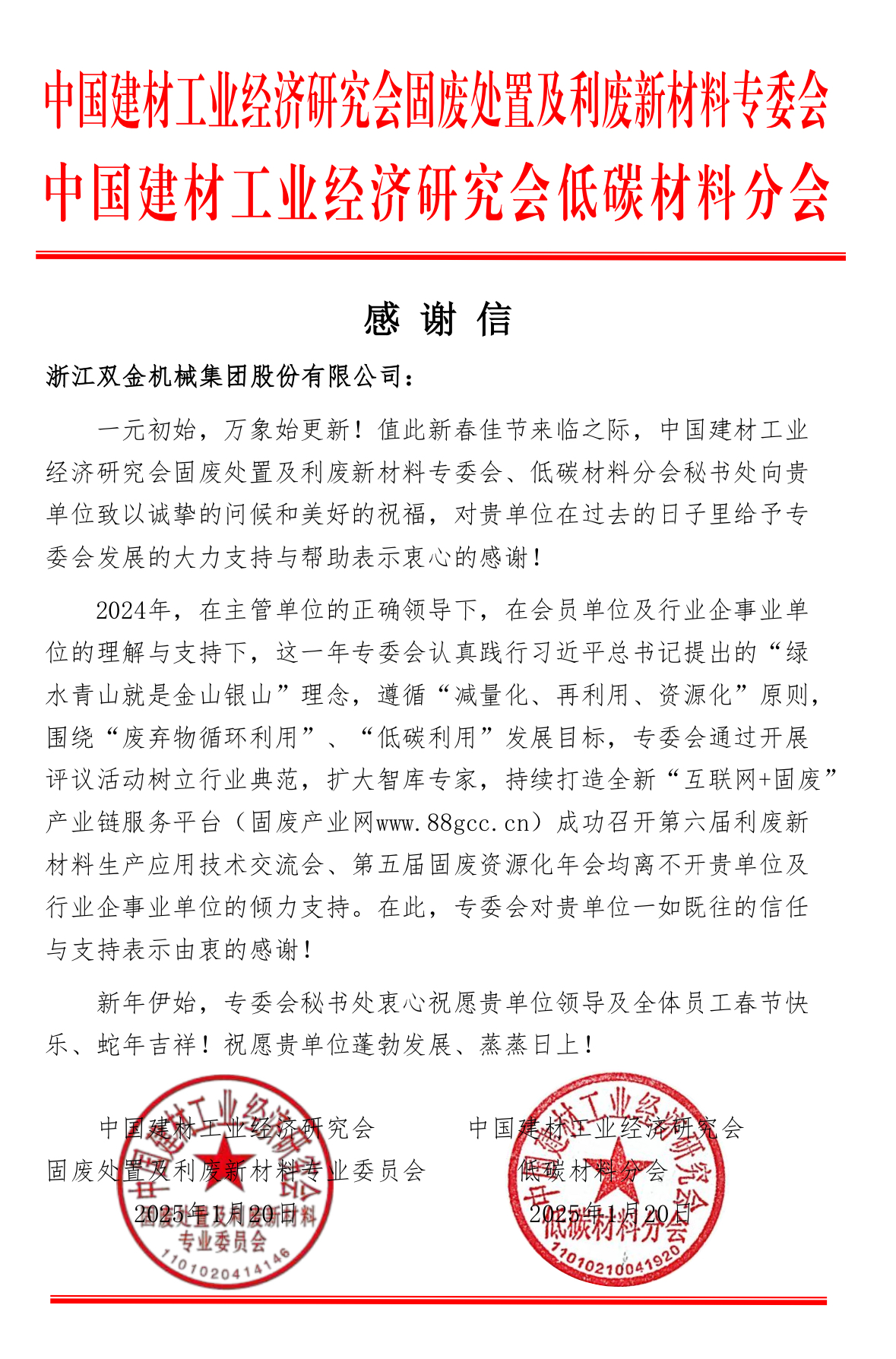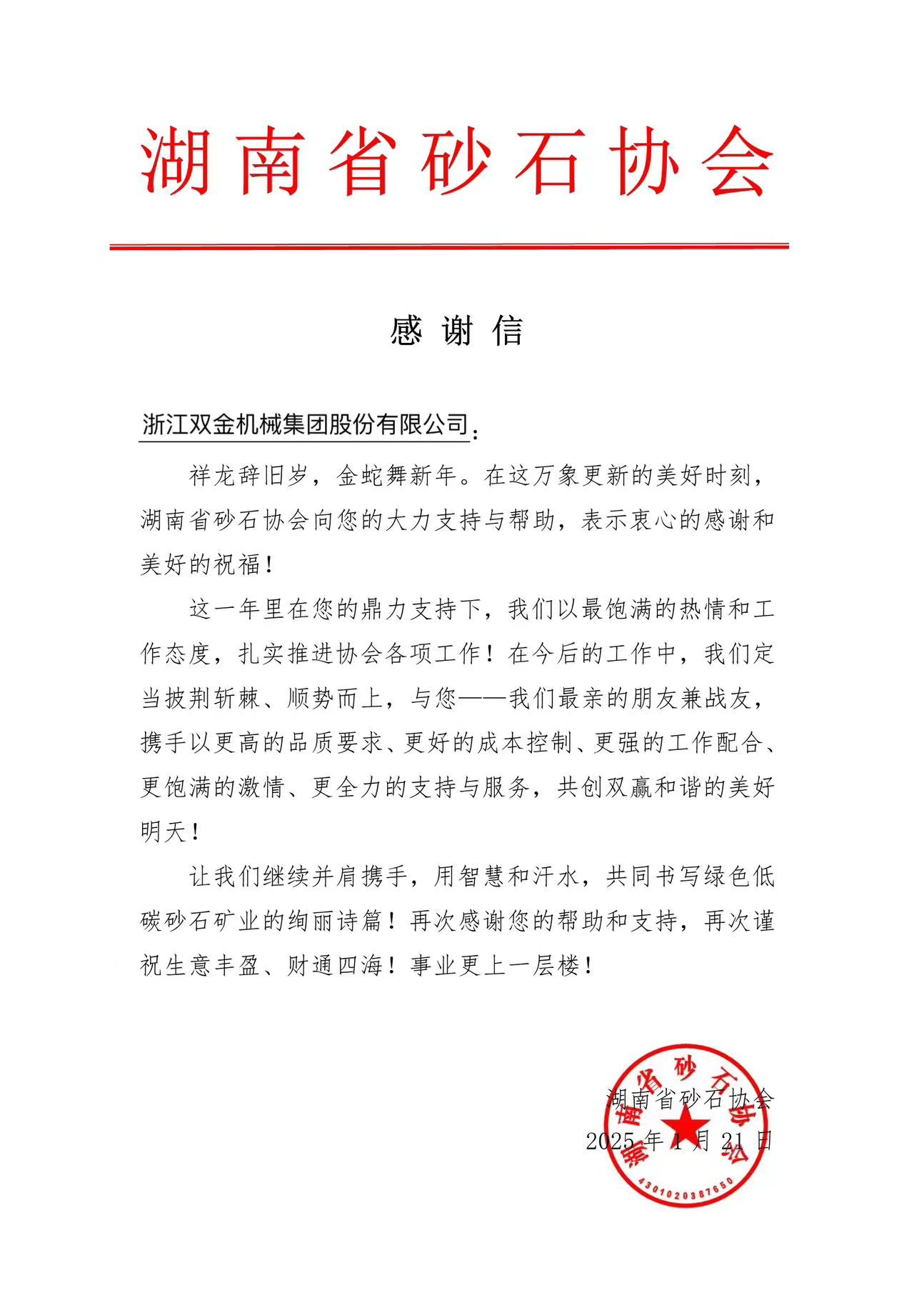 新年伊始,浙江雙金機械集團股份有限公司便收獲了來自行業(yè)內(nèi)的高度認可。中國砂石協(xié)會、湖南省砂石協(xié)會、中國建材工業(yè)經(jīng)濟研究會固廢處理及利廢新材料專業(yè)委員會以及中國建材工業(yè)經(jīng)濟研究會低碳材料分會紛紛向浙江雙金機械集團股份有限公司發(fā)來感謝信,對雙金機械在過去一年里為行業(yè)發(fā)展所做出的突出貢獻表示誠摯感謝。