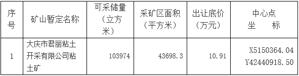 根據(jù)國(guó)土資源部《探礦權(quán)采礦權(quán)招標(biāo)拍賣掛牌管理辦法(試行)》的規(guī)定,大慶市國(guó)土資源局決定以掛牌方式出讓下列粘土礦采礦權(quán)。現(xiàn)將有關(guān)事項(xiàng)公告如下: