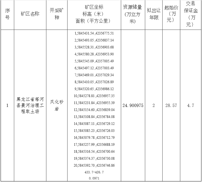 根據(jù)國土資源部《礦業(yè)權交易規(guī)則》(國土資規(guī)〔2017〕7號),大興安嶺地區(qū)行署國土資源局將對塔河縣1宗采石場采礦權進行公開掛牌出讓?,F(xiàn)將有關事項公告如下: