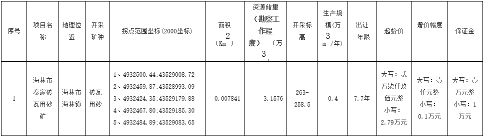 依據(jù)《中華人民共和國礦產(chǎn)資源法》、《礦產(chǎn)資源開采登記管理辦法》(中華人民共和國國務(wù)院令第241號)、《探礦權(quán)采礦權(quán)招標拍賣掛牌管理辦法(試行)》(國土資發(fā)〔2003〕197號)、《礦業(yè)權(quán)交易規(guī)則》(國土資規(guī)〔2017〕7號)等有關(guān)規(guī)定,擬以掛牌方式公開出讓海林市秦家磚瓦用砂礦采礦權(quán)。現(xiàn)將有關(guān)事項公告如下: