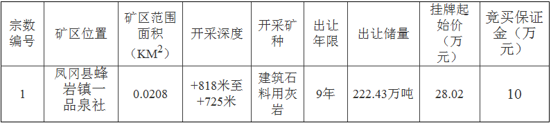 根據(jù)《中華人民共和國礦產(chǎn)資源法》、《礦產(chǎn)資源開采登記管理辦法》、《探礦權(quán)采礦權(quán)招標(biāo)拍賣掛牌管理辦法》之規(guī)定,鳳岡縣國土資源局對(duì)鳳岡縣蜂巖鎮(zhèn)一品泉社區(qū)采石場(chǎng)采礦權(quán)進(jìn)行公開出讓?,F(xiàn)將有關(guān)事宜公告如下: