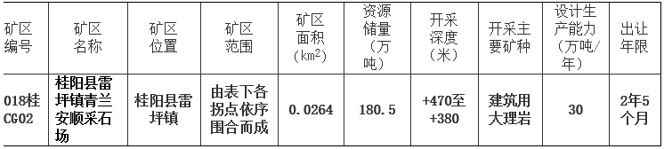 根據(jù)《中華人民共和國(guó)礦產(chǎn)資源法》、國(guó)土資源部關(guān)于印發(fā)《礦業(yè)權(quán)交易規(guī)則》(國(guó)土資規(guī)〔2017〕7號(hào))的通知和《國(guó)土資源部關(guān)于完善礦產(chǎn)資源開采審批登記管理有關(guān)事項(xiàng)的通知》(國(guó)土資規(guī)〔2017〕16號(hào))和《湖南省人民政府辦公廳關(guān)于印發(fā)〈湖南省礦業(yè)權(quán)招標(biāo)拍賣掛牌出讓管理辦法〉的通知》(湘政辦發(fā)〔2016〕65號(hào))等有關(guān)規(guī)定,經(jīng)桂陽(yáng)縣人民政府批準(zhǔn)同意,我局決定在湖南省國(guó)土資源網(wǎng)上交易系統(tǒng)(以下簡(jiǎn)稱“網(wǎng)掛系統(tǒng)”)(http://www.hngtjy.com)以掛牌方式出讓以下礦區(qū)采礦權(quán),并委托桂陽(yáng)縣國(guó)土資源產(chǎn)權(quán)交易中心承辦具體事宜。現(xiàn)將有關(guān)事項(xiàng)公告如下: