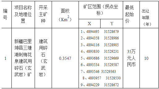 為深化礦產(chǎn)資源有償使用制度改革,培育和規(guī)范采礦權(quán)市場(chǎng),根據(jù)《中華人民共和國礦產(chǎn)資源法》、《礦產(chǎn)資源開采登記管理辦法》、國土資源部《探礦權(quán)采礦權(quán)招標(biāo)拍賣掛牌管理辦法(試行)》等有關(guān)規(guī)定,哈密地區(qū)國土資源局委托哈密地區(qū)土地礦產(chǎn)資源儲(chǔ)備交易中心對(duì)下列采礦權(quán)以掛牌方式公開出讓。現(xiàn)將有關(guān)事項(xiàng)公告如下: