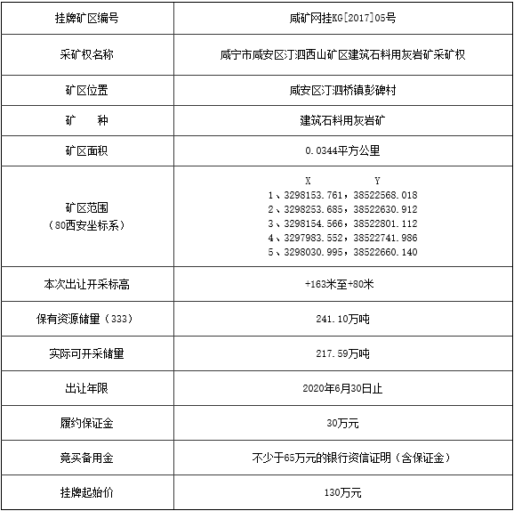 根據(jù)《中華人民共和國礦產(chǎn)資源法》、《探礦權(quán)采礦權(quán)招標(biāo)拍賣掛牌管理辦法》和《咸寧市采礦權(quán)網(wǎng)上掛牌出讓規(guī)則》等法律和規(guī)定,經(jīng)咸安區(qū)人民政府批準(zhǔn),咸安區(qū)國土資源局定于2017年11月15日至2017年12月21日,在湖北省咸寧市國土資源網(wǎng)上交易系統(tǒng)公開掛牌出讓咸礦網(wǎng)掛KG[2017]05號采礦權(quán),并委托咸寧市礦業(yè)權(quán)儲備交易中心具體承辦,現(xiàn)將有關(guān)事項公告如下: