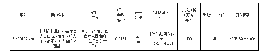 1.本次招標(biāo)出讓的采礦權(quán)為規(guī)劃保留的柳州市柳北區(qū)石碑坪鎮(zhèn)大田山石灰?guī)r礦擴(kuò)大礦區(qū)增加的資源儲(chǔ)量部分采礦權(quán),該部分采礦權(quán)不具備獨(dú)立開發(fā)條件,新出讓的采礦權(quán)必須利用原礦山的開采系統(tǒng),包括場(chǎng)地、設(shè)備進(jìn)行生產(chǎn)。