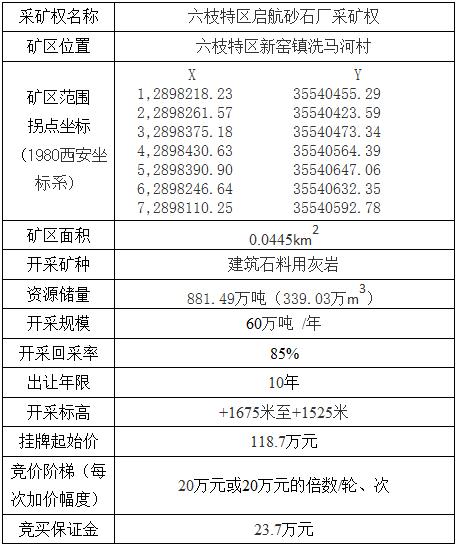 根據(jù)《中華人民共和國礦產(chǎn)資源法》、國土資源部《探礦權(quán)采礦權(quán)招標(biāo)拍賣掛牌管理辦法(試行)》、國土資源部關(guān)于印發(fā)《礦業(yè)權(quán)交易規(guī)則》的通知(國土資規(guī)〔2017〕7號)及有關(guān)法律法規(guī)的規(guī)定,六枝特區(qū)國土資源局決定向社會公開掛牌出讓六枝特區(qū)啟航砂石廠等2宗采礦權(quán)。本次掛牌出讓地點(diǎn)在六盤水市公共資源交易中心,現(xiàn)將有關(guān)事項(xiàng)公告如下: