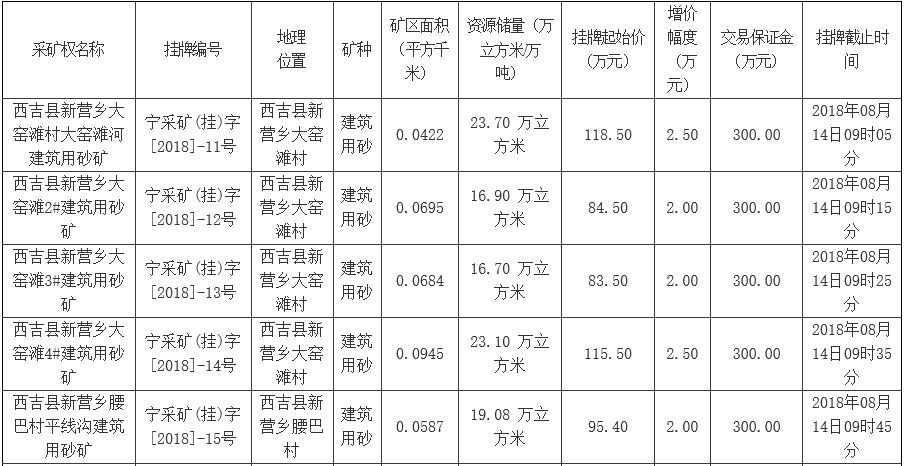 以上各采礦權(quán)掛牌開(kāi)始時(shí)間(網(wǎng)上申請(qǐng)、繳納保證金、報(bào)價(jià)起始時(shí)間)均為2018年07月30日08時(shí)00分;網(wǎng)上申請(qǐng)、交易保證金繳納(到賬)截止時(shí)間均為2018年08月13日16時(shí)30分。