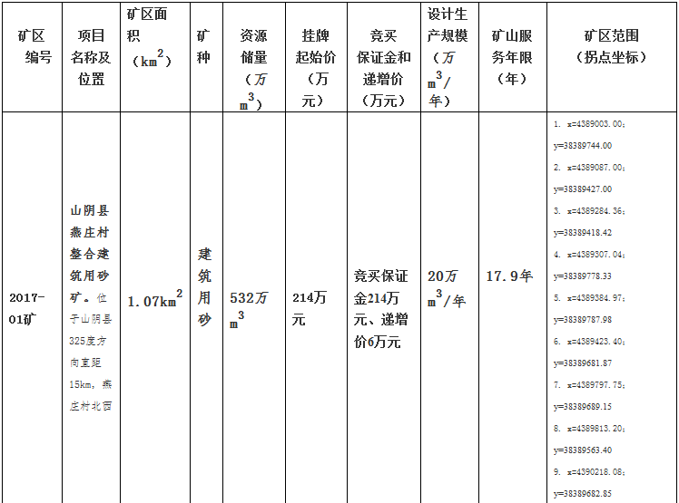 根據(jù)《中華人民共和國礦產(chǎn)資源法》、國土資源部《探礦權(quán)采礦權(quán)招標拍賣掛牌管理辦法(試行)》及《山西省礦產(chǎn)資源管理條例》等法律、法規(guī)規(guī)定,山陰縣國土資源局將編號為2017-01號砂石廠采礦權(quán)進行掛牌出讓?,F(xiàn)將有關(guān)事項公告如下: