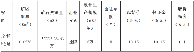 根據(jù)社會經濟發(fā)展和市場的需要,結合我縣砂石礦山整合工作實際,按照《中華人民共和國礦產資源法》、《礦產資源開采登記管理辦法》和國土資源部《關于印發(fā)〈探礦權采礦權招標拍賣掛牌管理辦法(試行)〉的通知》等文件精神,石阡縣國土資源局委托銅仁市公共資源交易中心石阡分中心對石阡縣白沙鎮(zhèn)柑子林砂石場采礦權以掛牌方式出讓,現(xiàn)將有關事項公告如下: