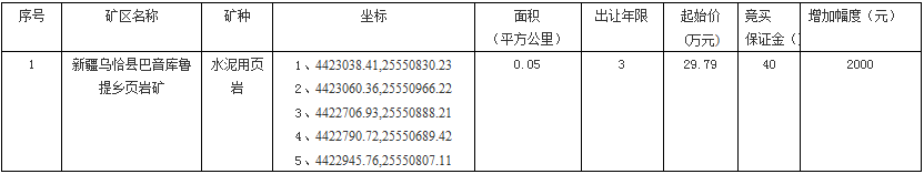 注:最終成交的采礦區(qū)范圍坐標(biāo)以與烏恰縣國(guó)土資源局簽訂出讓合同中確定的采礦區(qū)范圍坐標(biāo)(西安1980坐標(biāo)系值)為準(zhǔn)(本次掛牌出讓礦權(quán)標(biāo)高:從2488米至2390米)。