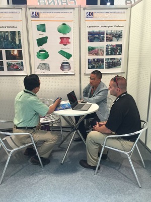 雙金公司作為國內破碎機行業(yè)的知名企業(yè),在國內市場上已經占據了重要的行業(yè)地位,而在海外市場卻處于默默無聞的狀況,此次亮相美國拉斯維加斯國際礦業(yè)展,雙金公司以“super technical,super service”的宗旨為海外客戶帶去高可靠性的產品。此次展會上,雙金機械展示了公司主打的SJ系列圓錐破碎機、液壓圓錐破碎機以及多種規(guī)格的破碎機配件,吸引了來自多國采購商在公司展臺索取資料和業(yè)務洽談,為進一步拓展海外市場和擴大破碎篩分設備的出口起到了積極的作用。期間,中國貿易促進會機械分會副會長和主任也來到公司的展臺與公司海外事業(yè)部總經理胡建華進行了簡短的交流。