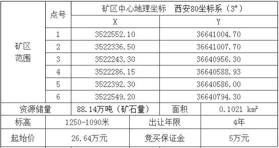鎮(zhèn)坪縣國(guó)土資源局?jǐn)M對(duì)鎮(zhèn)坪縣上竹鎮(zhèn)寨灣建筑石料用灰?guī)r礦擬定礦區(qū)范圍、面積、標(biāo)高、起始價(jià)、采礦權(quán)年限等情況見(jiàn)下表: