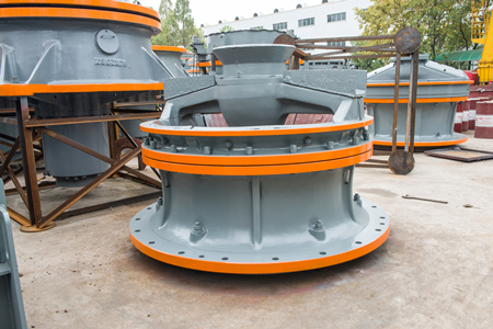 由電機帶動水平軸旋轉(zhuǎn),水平軸通過齒輪帶動偏心軸套旋轉(zhuǎn),再由偏心軸套帶動動錐部做圓周運動,從而實現(xiàn)連續(xù)的擠壓破碎石料。通過調(diào)整動錐底部的液壓缸可以使動錐上下運動從而方便的調(diào)整排料口的大小,方便地調(diào)整產(chǎn)品粒度大小。同時液壓缸也提供過鐵保護(hù)功能,當(dāng)鐵塊進(jìn)入破碎腔時,動錐自動下落釋放鐵塊保護(hù)破碎機,鐵塊排出后動錐自動回復(fù),設(shè)備恢復(fù)正常工作狀態(tài)繼續(xù)破碎。